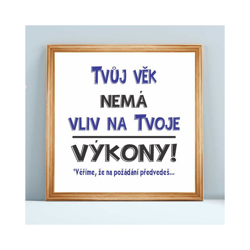 Hledáte originální a vtipný dárek k 95. narozeninám? Tento stylový obraz s humorným nápisem „Tvůj věk nemá vliv na tvoje výkony“ je perfektní volbou pro každého oslavence, který si i v 95 letech udržuje elán, optimismus a smysl pro humor.