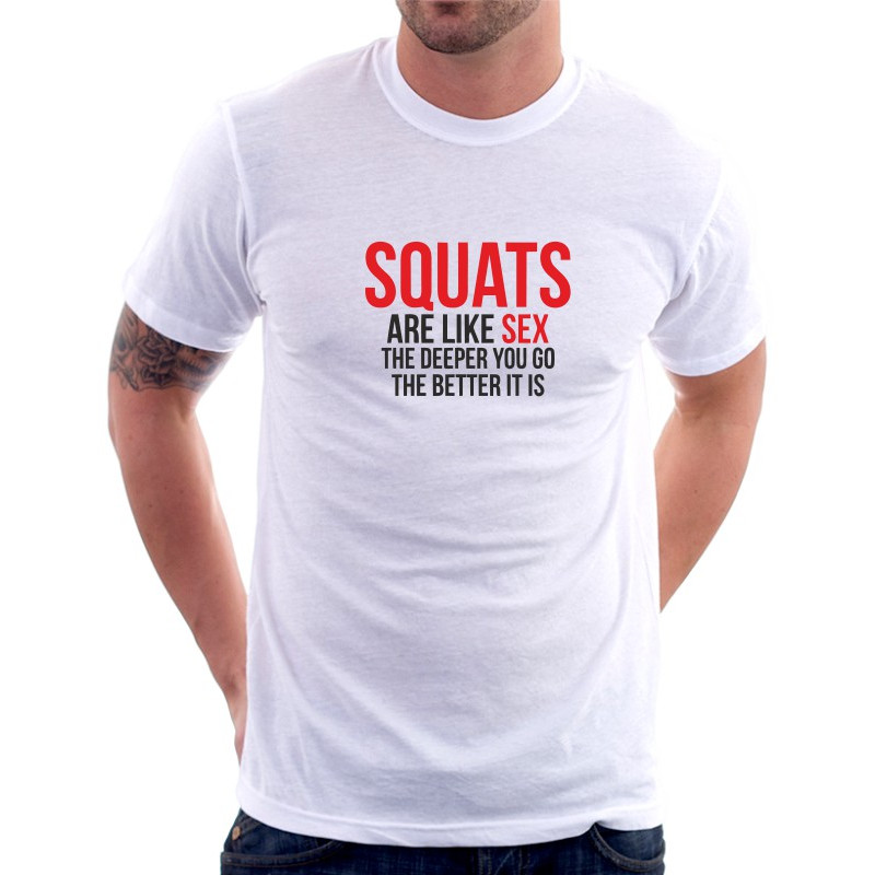 Tričko nese vtipný nápis "SQUATS are like sex the deeper you go the better it is," což zajišťuje, že okolo vás vzbudí úsměv a smích.