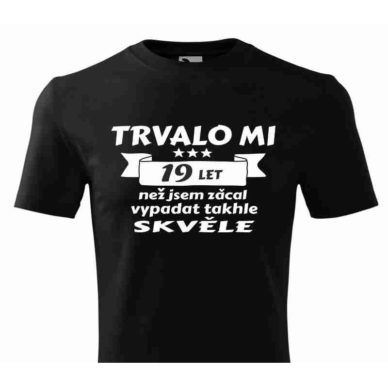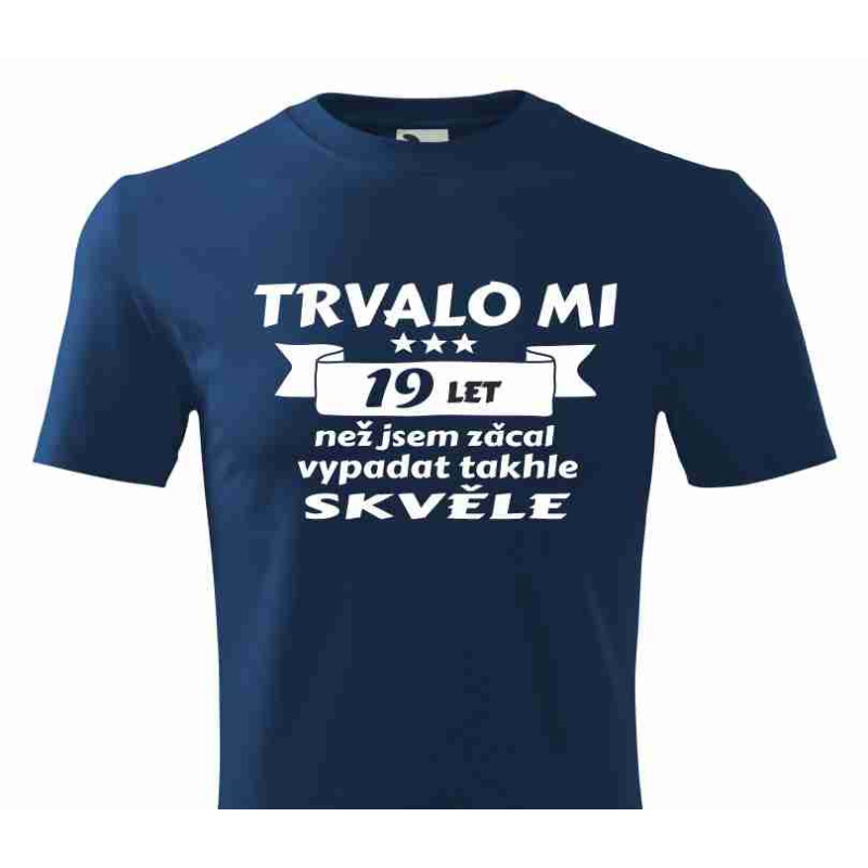 Pánské tričko "Trvalo 19 let, než jste začali vypadat takhle skvěle". Tričko na oslavu 19. narozenin, které je také vhodným vtipným dárkem k 19. narozeninám pro syna, bratra, vnuka nebo kamaráda. Udělá velkou radost a pobaví.