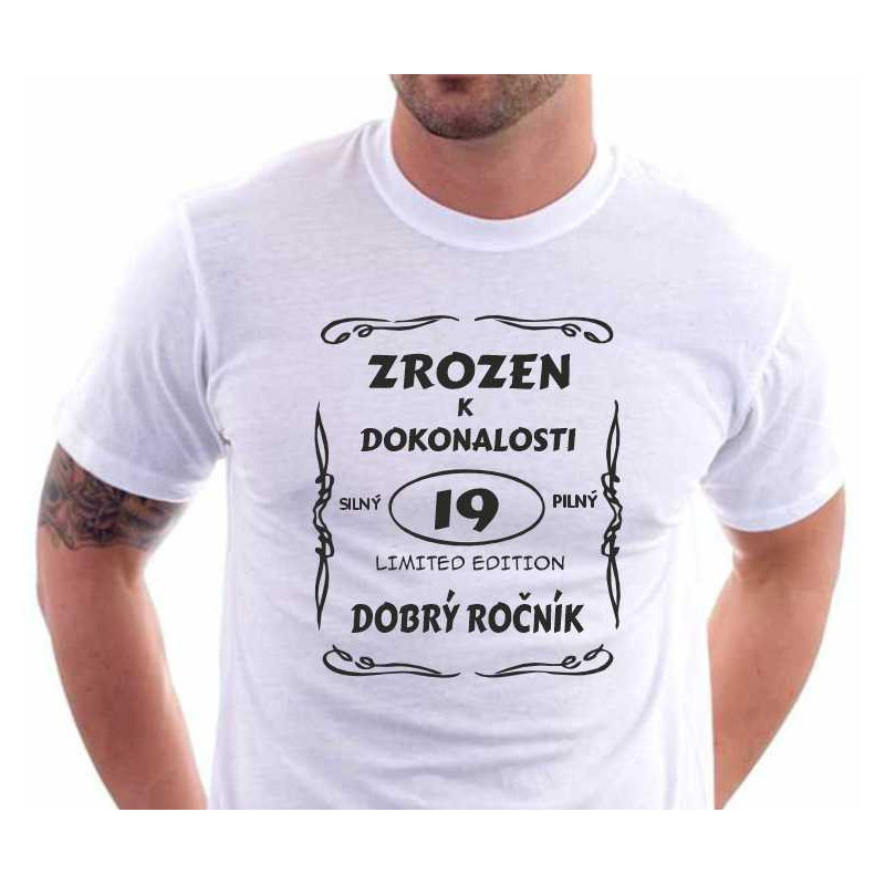 Pánské tričko pro oslavence 19 narozenin "Zrozen k dokonalosti - Dobrý ročník." Tričko je skvělým dárkem, který oslavenec 19. narozenin určitě využije nejen na svou oslavu, ale také ve všední dny. Udělejte radost tímto tričkem bratrovi, synovi nebo kamarádovi.