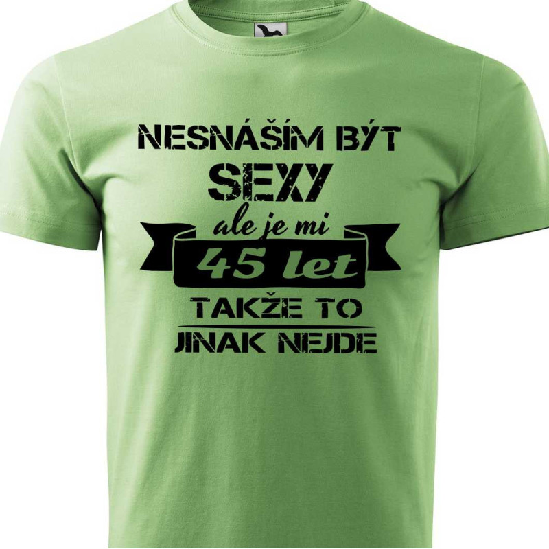 Pánské bavlněné tričko s potiskem "Nesnáším být sexy, ale je mi 45 let, takže to jinak nejde". Tričko je skvělým vtipným dárkem k 45. narozeninám a bude se všem líbit na narozeninové oslavě.