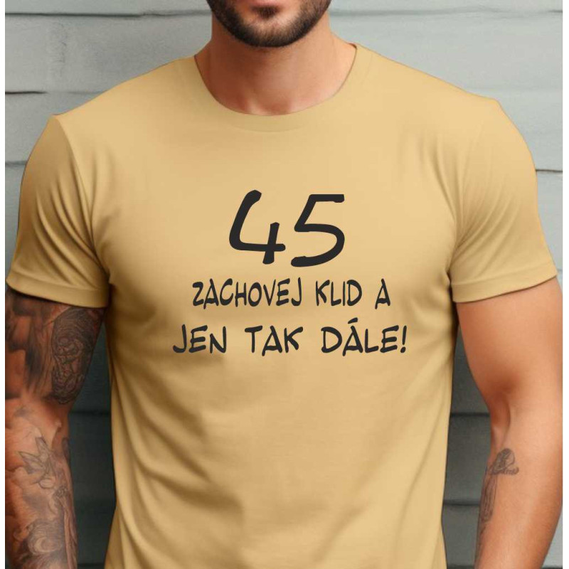 Pánské bavlněné tričko s krátkým rukávem s vtipným potiskem. Tričko je ideálním dárkem k 45. narozeninám, je to dárek praktický protože trička každý nosí a také je potřebuje. Triko s potiskem je tedy nejen užitečným, ale i dárkem, který zaujme a potěší a udělá z narozenin zážitek.