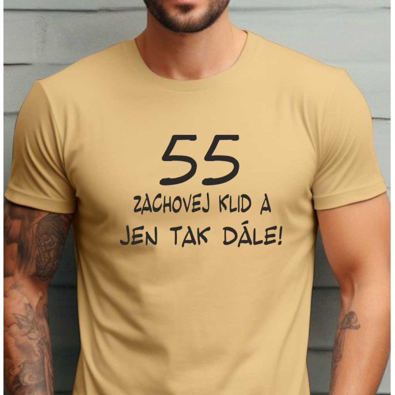 Pánské bavlněné tričko s krátkým rukávem s vtipným potiskem. Tričko je ideálním dárkem k 55. narozeninám, je to dárek praktický protože trička každý nosí a také je potřebuje. Triko s potiskem je tedy nejen užitečným, ale i dárkem, který zaujme a potěší a udělá z narozenin zážitek.