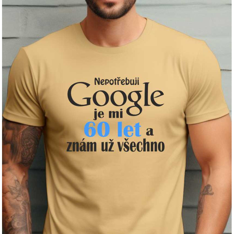 Pánské bavlnění tričko s potiskem "Nepotřebuji Google je mi 60 let a znám všechno". Tričko je skvělým dárkem k 60. narozeninám a bude hvězdou na narozeninové oslavě.