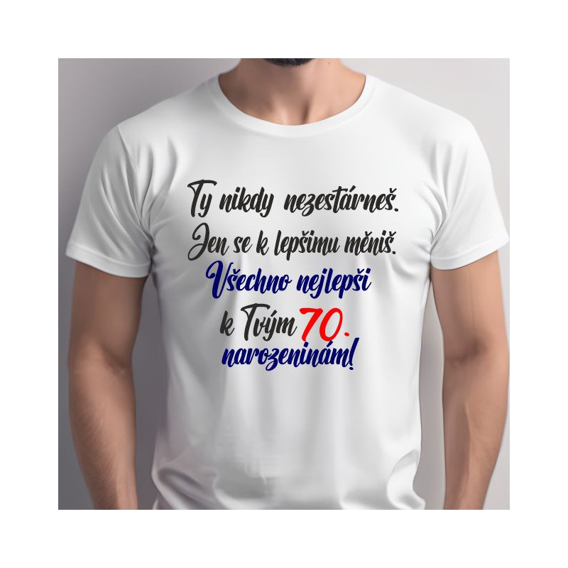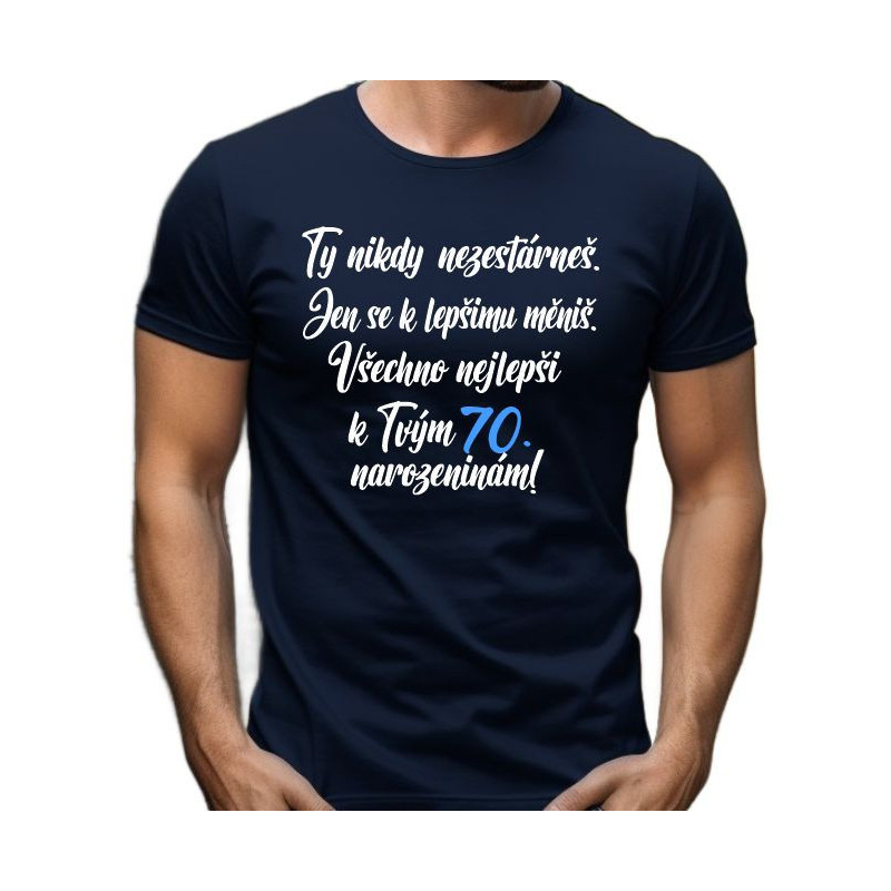 Oslava 70. narozenin si zaslouží něco stylového a vtipného! Pánské tričko s nápisem "Ty nikdy nezestárneš" a přáním "Všechno nejlepší k 70. narozeninám" je perfektní volbou, jak oslavenci ukázat, že věk je jen číslo, ale charisma a humor zůstávají navždy.