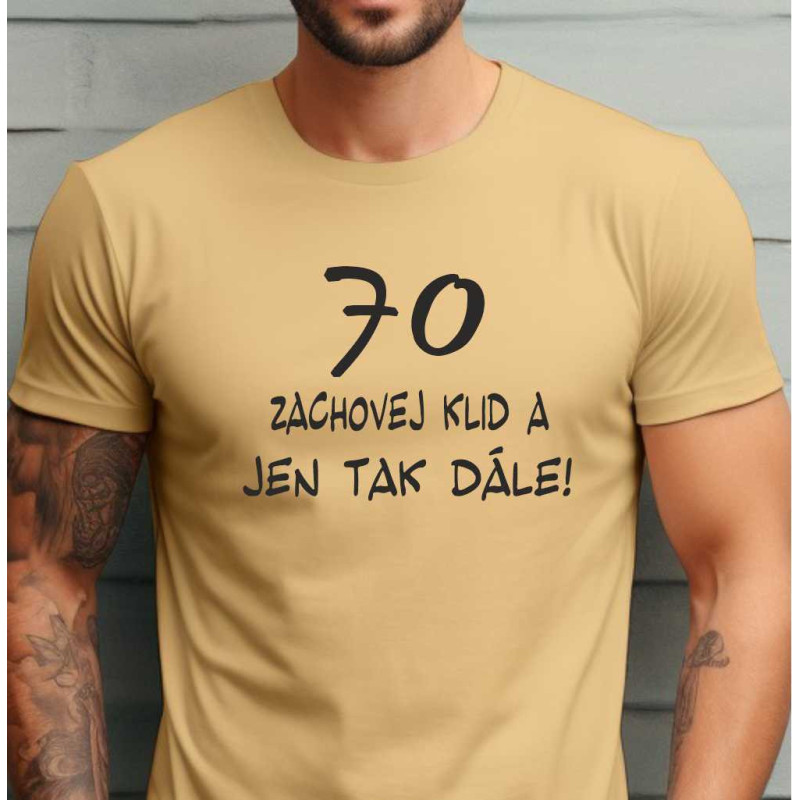 Pánské bavlněné tričko s krátkým rukávem s vtipným potiskem. Tričko je ideálním dárkem k 70. narozeninám, je to dárek praktický protože trička každý nosí a také je potřebuje. Triko s potiskem je tedy nejen užitečným, ale i dárkem, který zaujme a potěší a udělá z narozenin zážitek.
