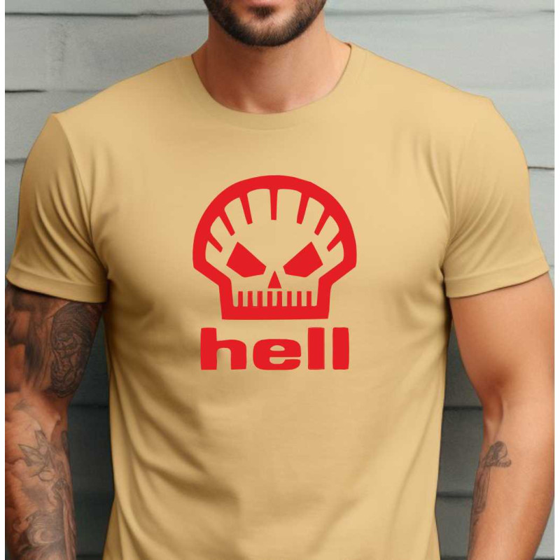 Pánské tričko "Hell" je kreativní parodií na ikonickou čerpací stanici shell a zároveň způsob, jak vyjádřit svůj jedinečný styl s dávkou humoru. Toto tričko je skvělým způsobem, jak vyjádřit svůj smysl pro humor a být vtipným středem pozornosti.
