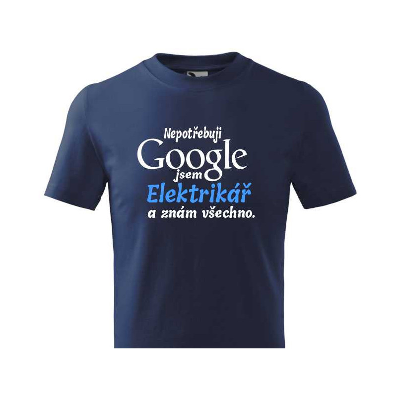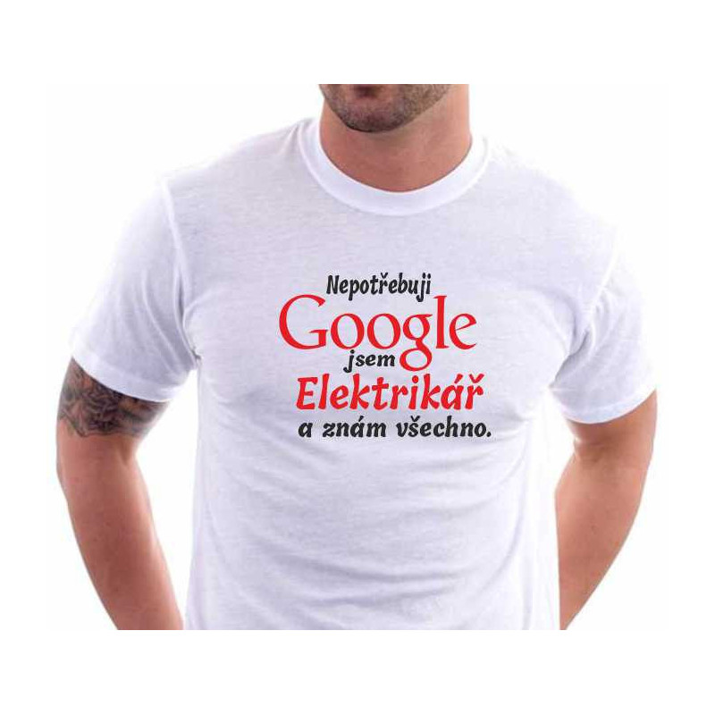 Jste elektrikář nebo hledáte dárek pro elektrikáře. Udělejte mu radost dárkem - vtipným tričkem s nápisem: Nepotřebuji Google jsem elektrikář a znám všechno.