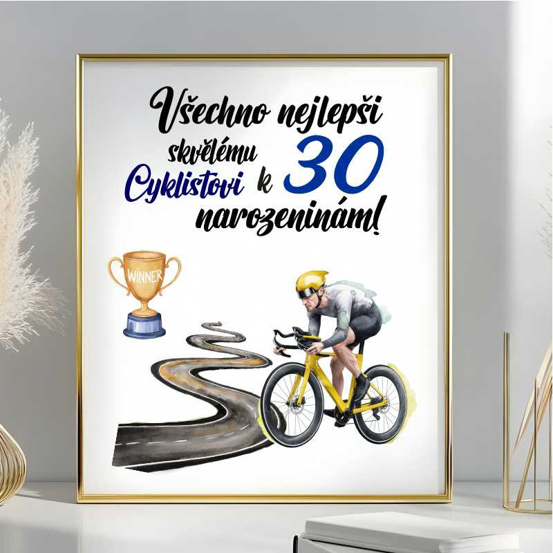 Stylové a originální přání k 30. narozeninám pro vášnivého cyklistu! Toto přání s nápisem „Všechno nejlepší skvělému cyklistovi k 30. narozeninám“ je perfektním dárkem pro všechny, kteří milují kola, rychlost a svobodu na dvou kolech.