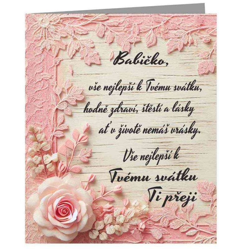 Přání k svátku pro babičku je tím nejkrásnějším způsobem, jak vyjádřit svou lásku a poděkování za všechny ty jedinečné chvíle. Jemné ilustrace a dojemná slova rozzáří její den a připomenou, jak moc si ji vážíte. Každé slovo i detail jsou navrženy tak, aby v ní vzbudily úsměv a zahřály ji u srdce.