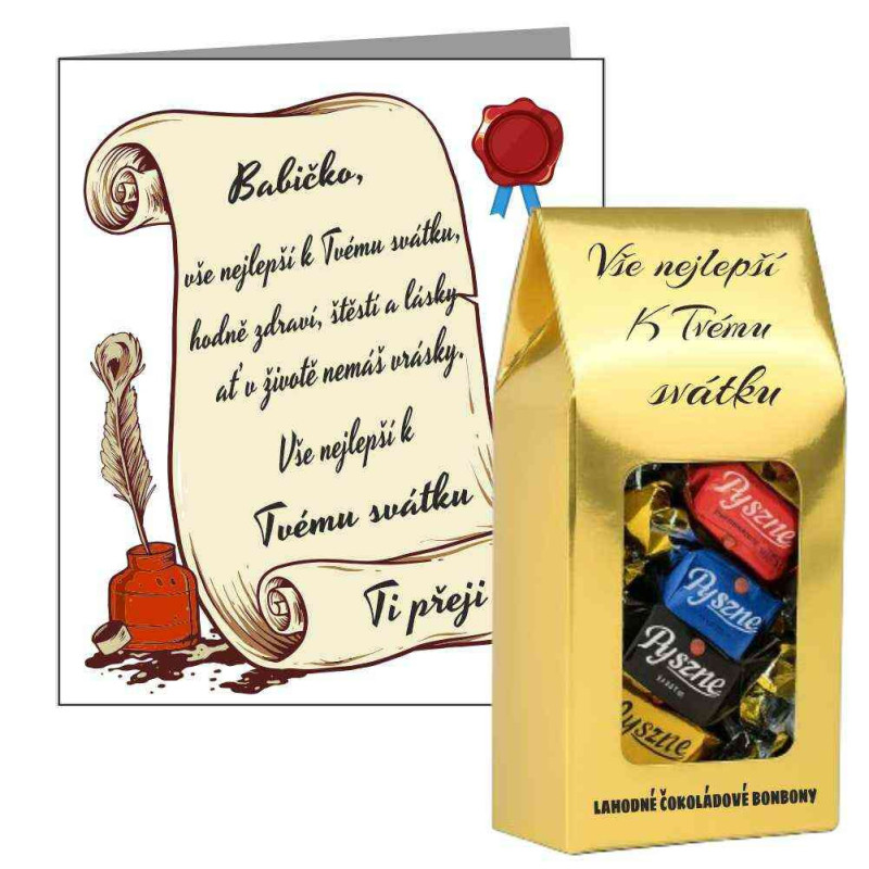 Toto přání k svátku pro babičku s čokoládovými bonbony spojuje krásný vzkaz z lásky a sladké překvapení v jednom elegantním balení.