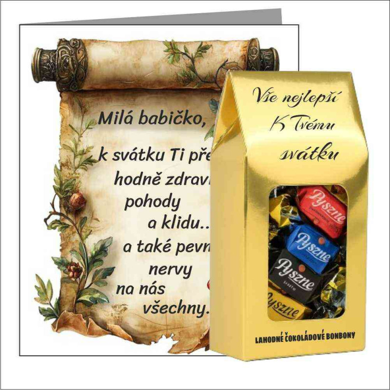 Dopřejte své babičce k svátku opravdu výjimečný dárek! Toto krásné přání k svátku pro babičku s čokoládovými bonbony ve zlaté krabičce spojuje eleganci, sladkost a láskyplné přání v jednom balení.