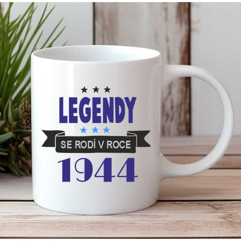 Hrnek s potiskem "Legendy se rodí v roce 1944." Praktický dárek k 82. narozeninám pro muže, kteří se narodili v roce 1944. Dárek, který zůstane vzpomínkou na dlouhou dobu a udělá radost.