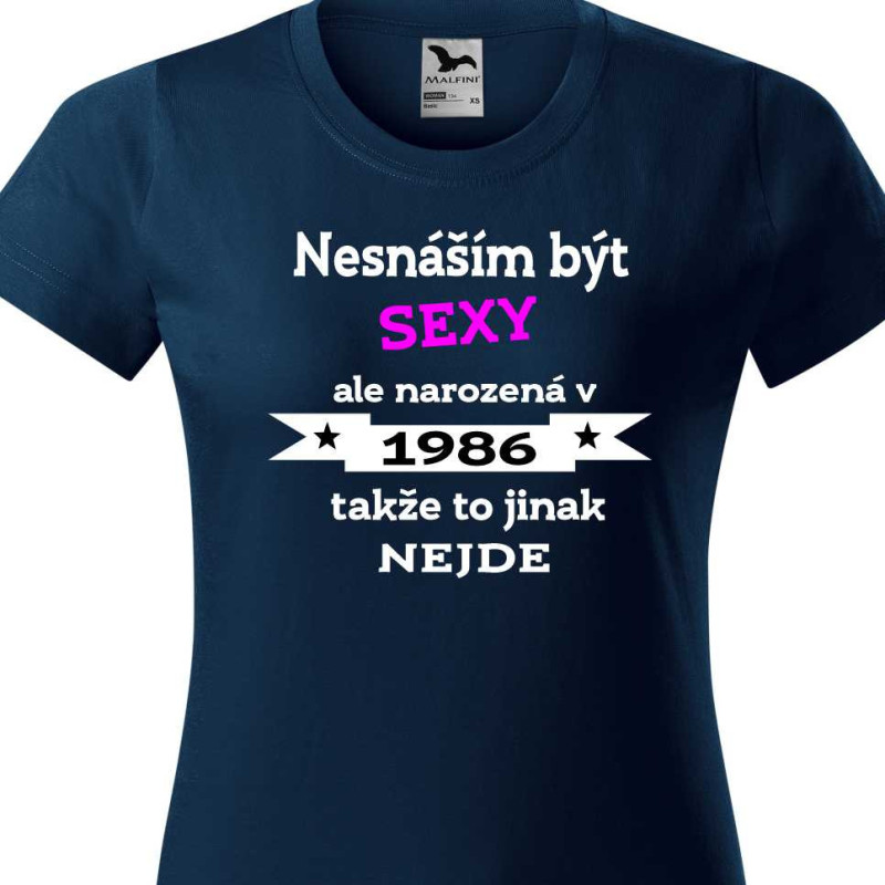 Dámské tričko s vtipným potiskem Nesnáším být sexy, ale narodila jsem se v roce 1986 takže to jinak nejde je ideálním vtipným dárkem k 40 narozeninám. Udělejte radost k oslavě narozenin tímto kvalitním bavlněným tričkem, které vykouzlí úsměv a bude připomínat tuto radostnou událost jěště po dlouhou dobu.