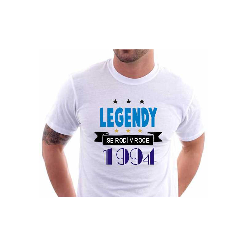 Pánské tričko s potiskem "Legendy se rodí v roce 1994" je stvořené pro narozené v roce 1994. Udělejte radost dárkem k narozeninám muži, který tričko bude využívat i dlouhou dobu po narozeninové oslavě.
