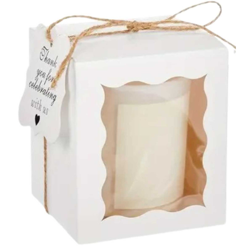 Svíčka je zabalena v okrasné krabičce s lahvičkou se zápalkami a škrtátkem.