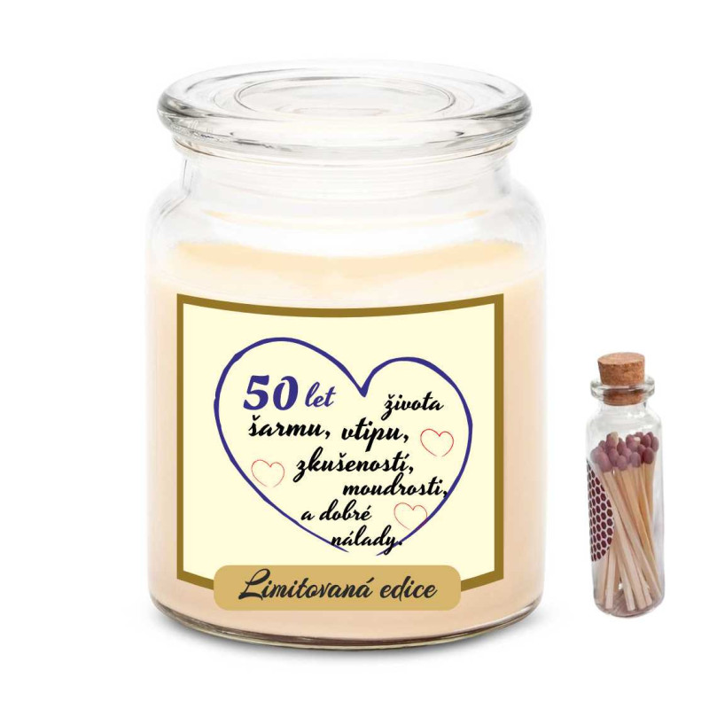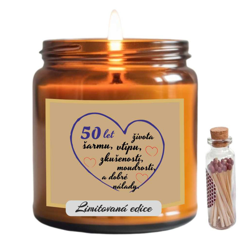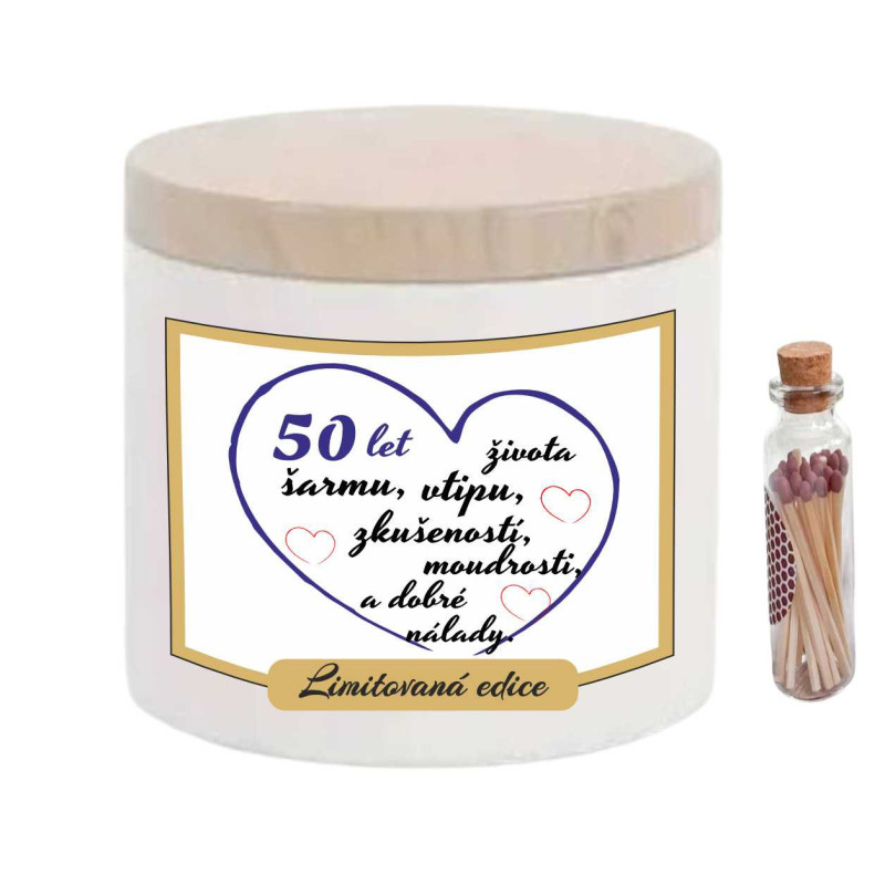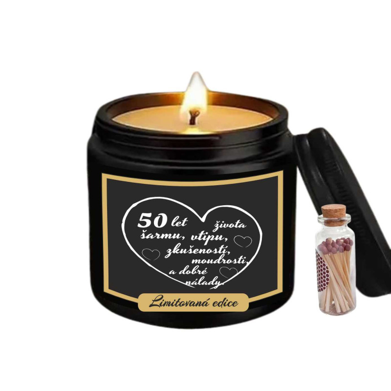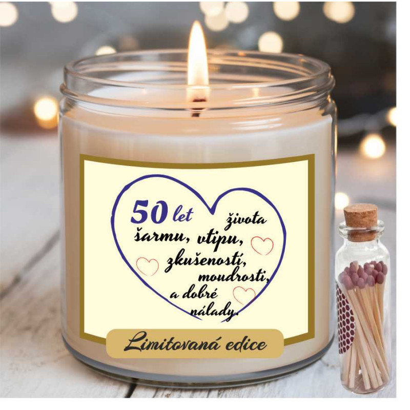 Oslavte půl století radosti, elegance a životních zkušeností s touto stylovou vonnou svíčkou! Perfektní dárek k 50. narozeninám pro každého, kdo si užívá život naplno a s úsměvem.