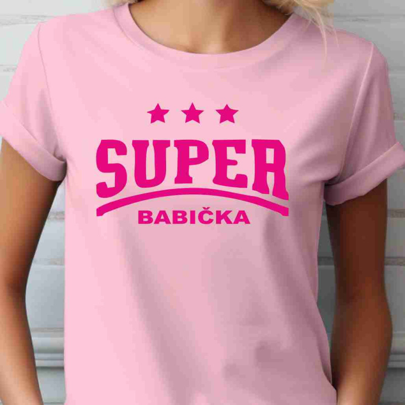Dámské bavlněné tričko s krátkým rukávem s nápisem: Super Babička. Udělejte babičce radost tímto tričkem, které je ideální jako dárek k Vánocům, narozeninám nebo jen tak pro radost. Udělá Vaší babičce velkou radost a bude ho nosit kdykoliv bude příležitost.