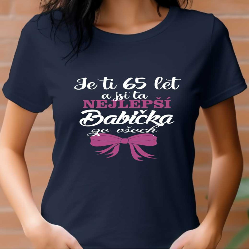 Dámské tričko s vtipným potiskem: Je ti 65 let a jsi ta nejlepší babička ze všech je originálním dárkem k 65. narozeninám pro babičku. Tričko s potiskem vytvoří příjemnou náladu, vykouzlí úsměv a bude vzpomínkou na oslavu 65. narozenin. Udělejte radost babičce tímto tričkem s upřimným nápisem.