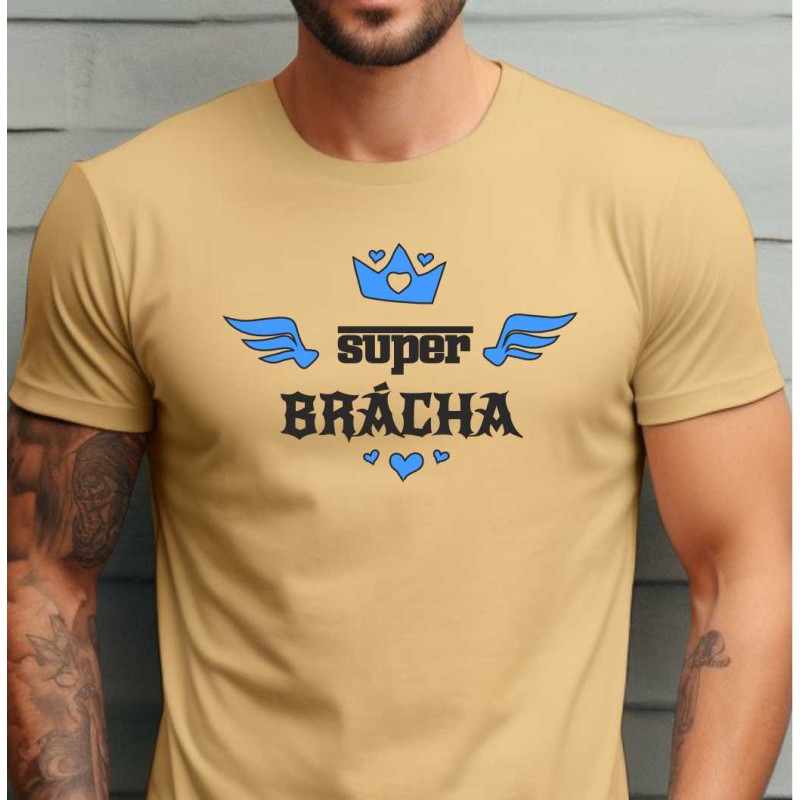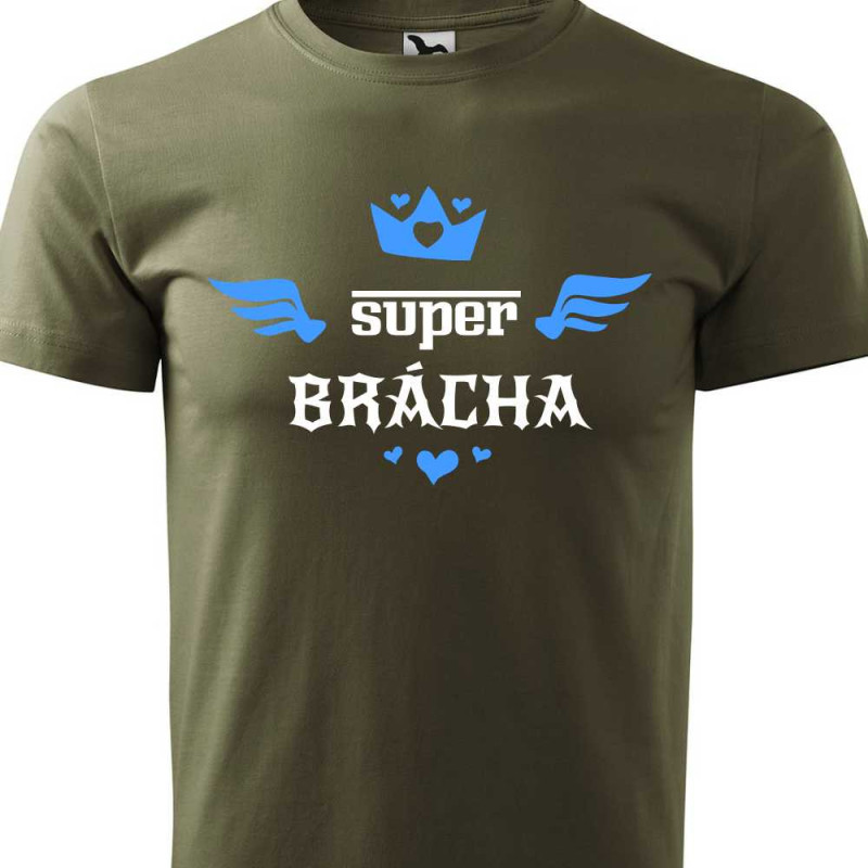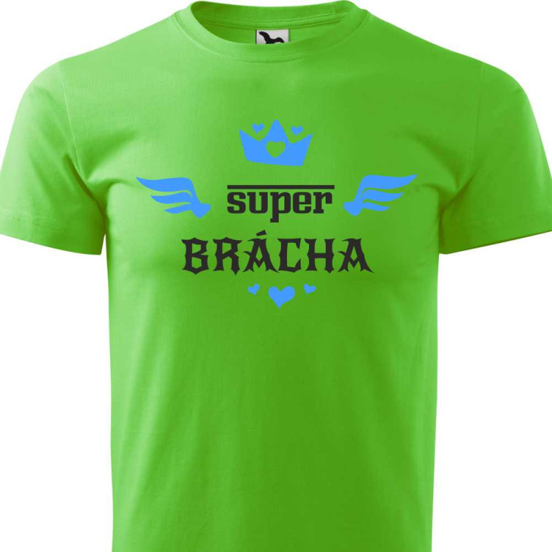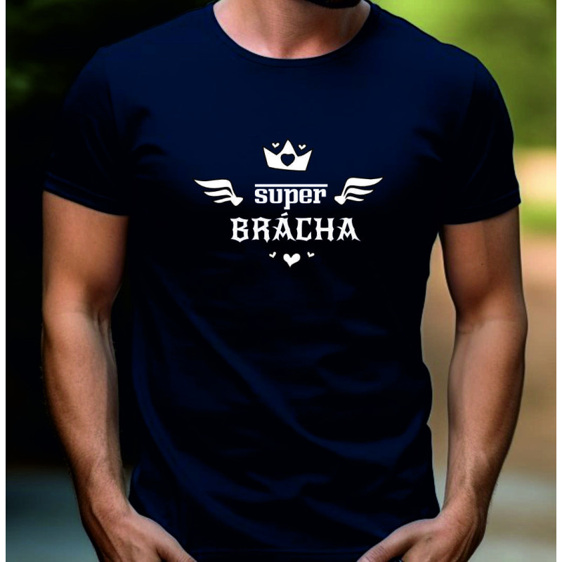 Pánské bavlněné tričko s krátkým rukávem s potiskem: Super brácha s křidýlky. Ideální dárek pro bratra k Vánocům nebo narozeninám. Udělejte bratrovi radost kvalitním tričkem, které bude s hrdostí nosit.
