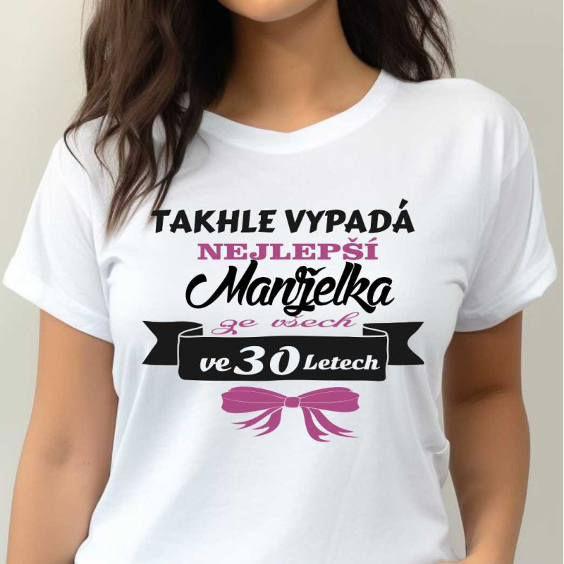 Hledáte dárek k 30 narozeninám pro manželku? Dámské tričko s vtipným potiskem: Takhle vypadá nejlepší manželka ze všech ve 30 letech je originálním a krásným dárkem k 30. narozeninám. Tričko s potiskem vytvoří příjemnou náladu, vykouzlí úsměv a bude vzpomínkou na oslavu 30. narozenin. Udělejte radost manželce tímto tričkem s velice pěkným narozeninovým nápisem.
