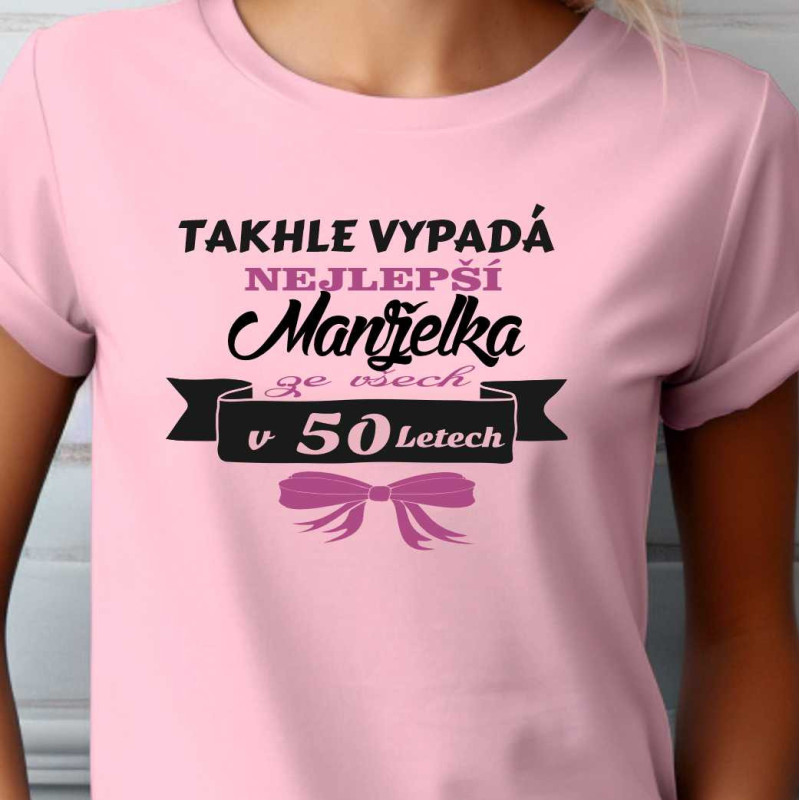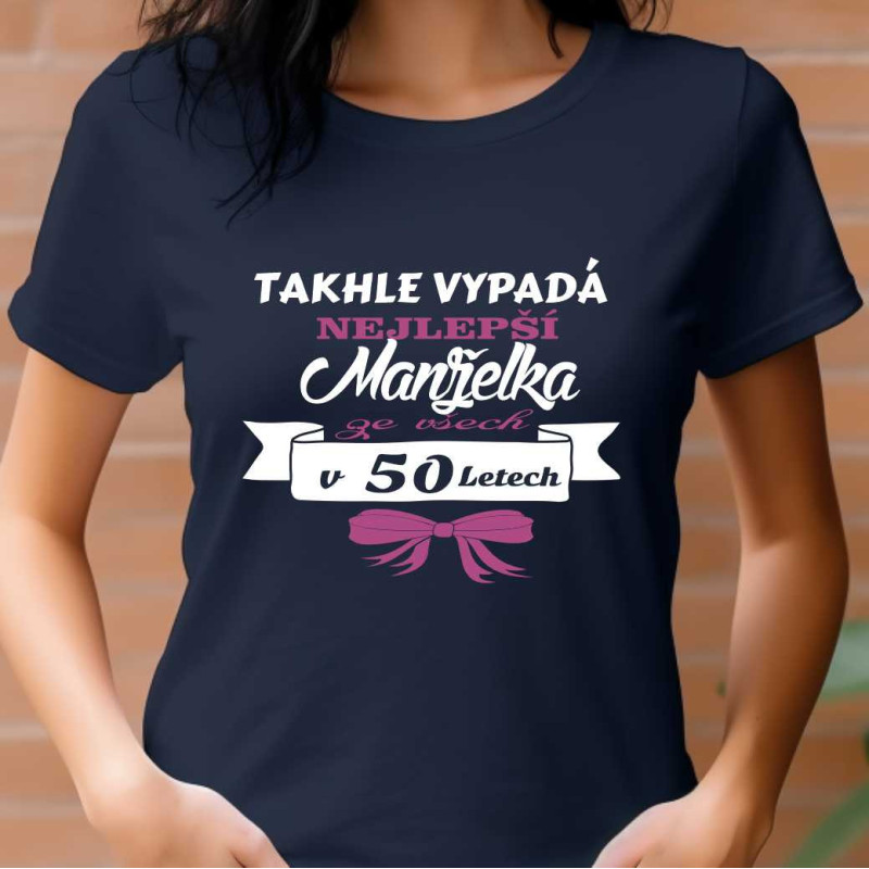 Hledáte dárek k 50 narozeninám pro manželku? Dámské tričko s vtipným potiskem: Takhle vypadá nejlepší manželka ze všech v 50 letech je originálním a krásným dárkem k 50. narozeninám. Tričko s potiskem vytvoří příjemnou náladu, vykouzlí úsměv a bude vzpomínkou na oslavu 50. narozenin. Udělejte radost manželce tímto tričkem s velice pěkným narozeninovým nápisem.