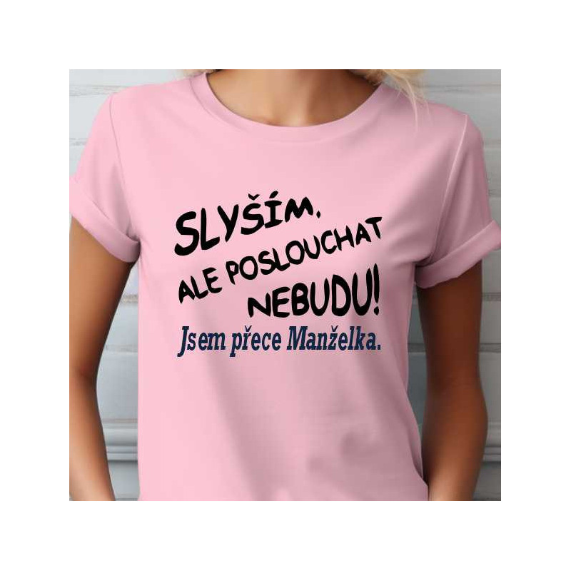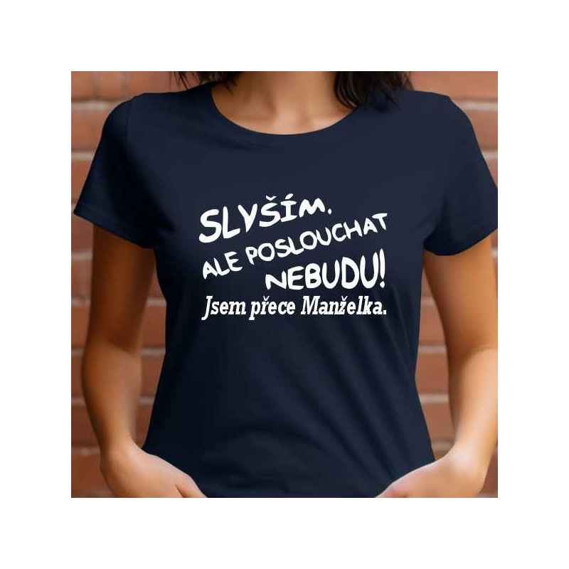 Hledáte originální dárek pro svou drahou polovičku, který vykouzlí úsměv na její tváři? Naše vtipné dámské tričko s výstižným nápisem "Slyším, ale poslouchat nebudu. Jsem přece manželka." je přesně to, co potřebujete!