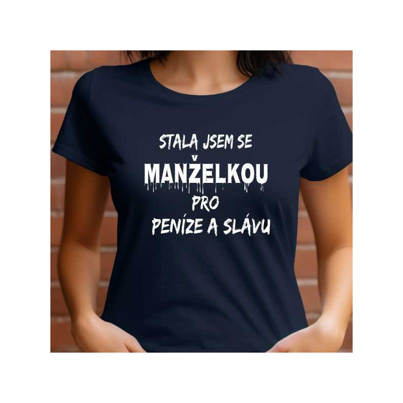 Hledáte originální dárek, který vaší manželce vykouzlí úsměv na tváři a zároveň ukáže, že máte smysl pro humor? Naše dámské tričko s vtipným nápisem "Stala jsem se manželkou pro peníze a slávu" je přesně to, co potřebujete!