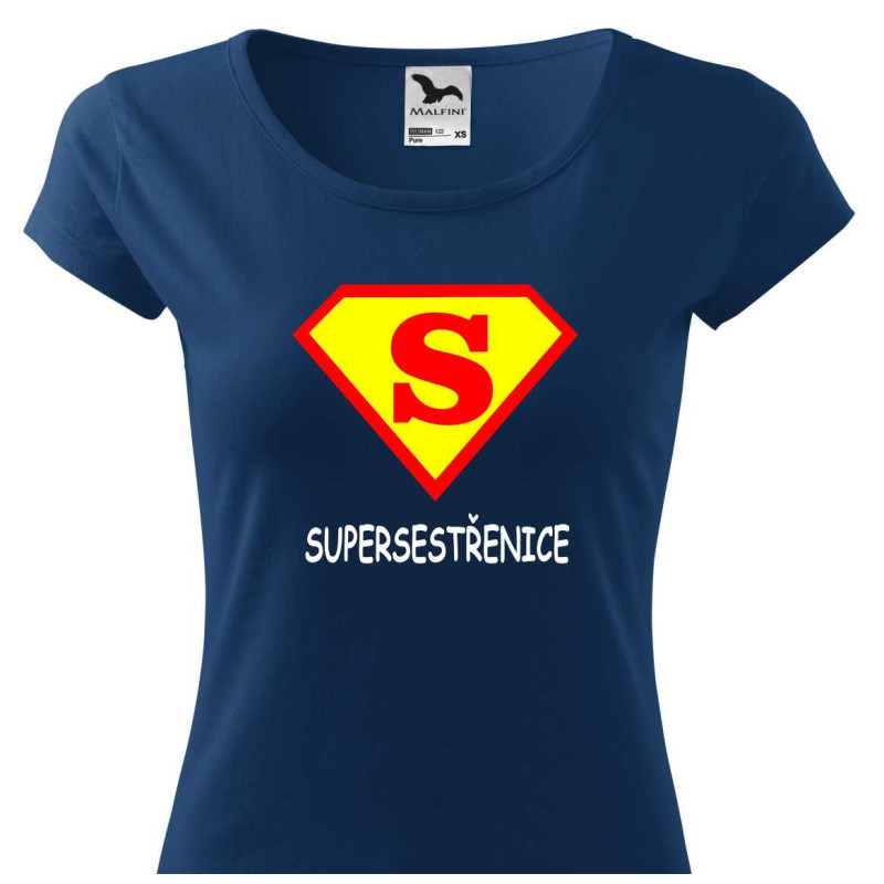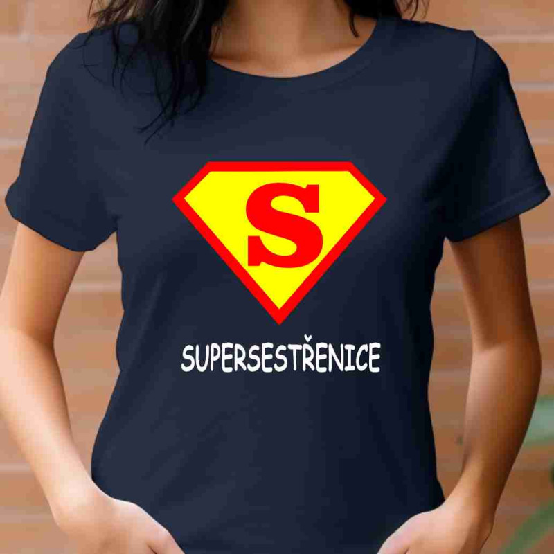 Dámské tričko s potiskem: Super sestřenice ve znaku supermana. Tričko je skvělé jako dárek k Vánocům nebo narozeninám pro sestřenici. Udělejte ji radost tímto kvalitním bavlněným tričkem krteré bude nosit s radostí.