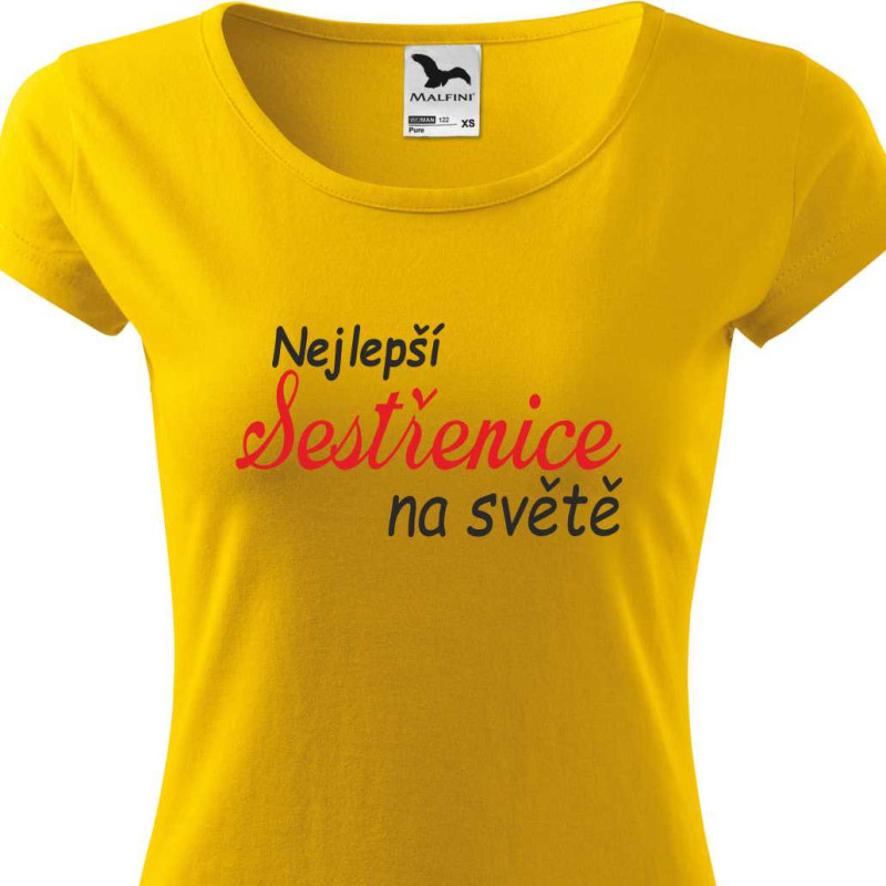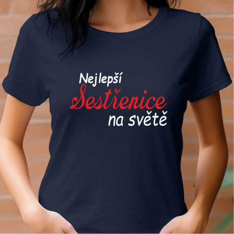 Dámské tričko s potiskem: Nejlepší sestřenice na světe. Tričko je skvělé jako dárek k Vánocům nebo narozeninám pro sestřenici. Udělejte ji radost tímto kvalitním bavlněným tričkem krteré bude nosit s radostí.
