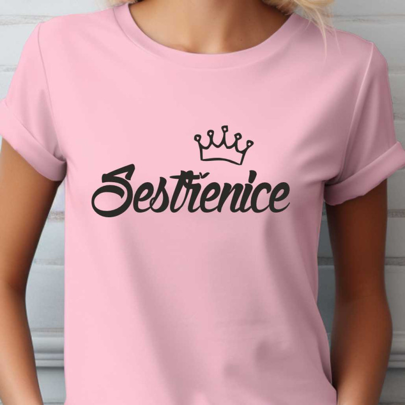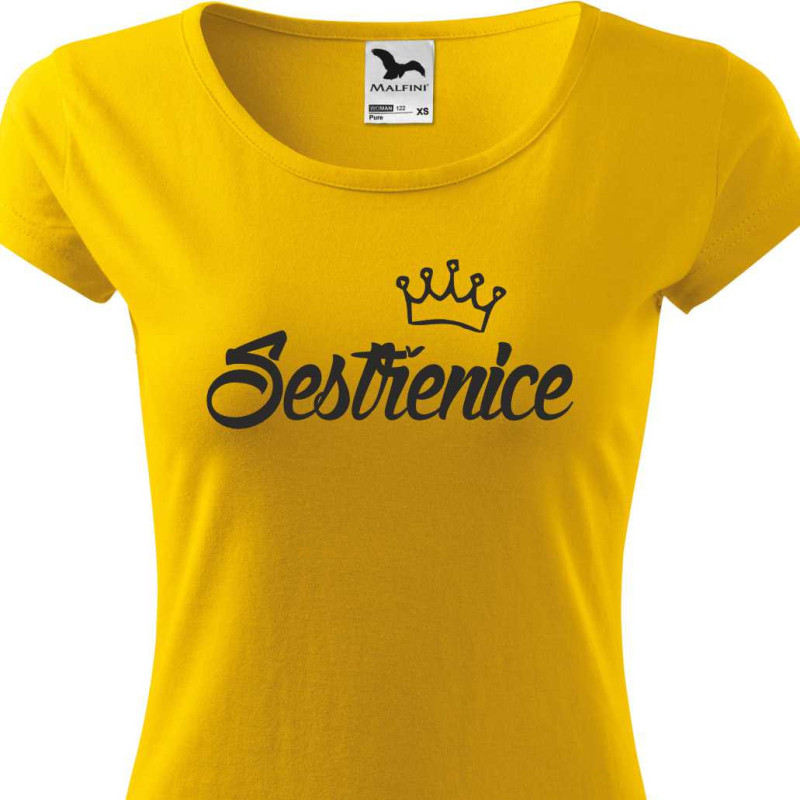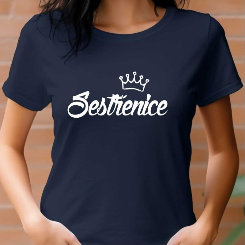 Dámské tričko s potiskem: Sestřenice s korunkou. Tričko je skvělé jako dárek k Vánocům nebo narozeninám pro sestřenici. Udělejte ji radost tímto kvalitním bavlněným tričkem krteré bude nosit s radostí.